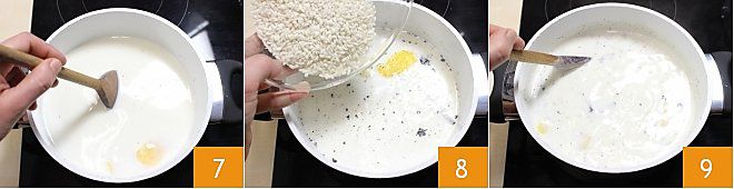 Mezcla para integrar todos los sabores y disolver el azúcar 7. Lleva la leche a casi hervir y luego agrega el arroz (Carnaroli o Arborio) 8 y cocina siempre a fuego suave, mezclando de vez en cuando 9. Deja en el fuego por 30 minutos y si se seca demasiado, agrega más leche caliente.