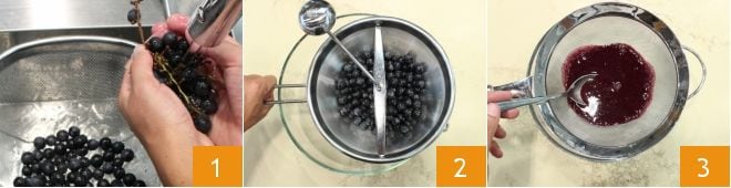 Para realizar el risotto con uva fresa, primero desprended las bayas de uva y enjuagadlas abundantemente bajo el agua corriente 2, pasad las bayas por el pasapurés 2, cuidando de reservar algunas para decorar el plato, luego colad la mezcla por un colador 3