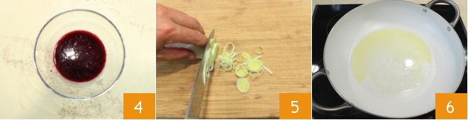 de este modo obtendréis un jugo denso 4. Cortad el puerro en rodajas finas 5, luego en una cacerola derretid 40 g de mantequilla a fuego moderado 6