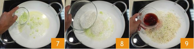 y luego añadid el puerro previamente cortado 7, sofreíd durante unos minutos, luego verted el arroz y tostadlo durante unos minutos removiendo continuamente, rociad con el vaso de vino tinto y dejad que se evapore.