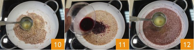 Proseguid la cocción añadiendo cuando sea necesario un cucharón de caldo vegetal 10, para preparar el caldo seguid nuestra receta Caldo de verduras. Añadid ahora el puré de uva fresa 11, mezclad bien hasta que se absorba, siempre a fuego lento, y continuad la cocción de vuestro risotto con uva fresa añadiendo un cucharón de caldo vegetal 12 cada vez que sea necesario hasta que esté completamente cocido, tardará unos 20 minutos.
