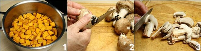 Para preparar el risotto de calabaza, setas y taleggio, corte la calabaza en rodajas, pélela y córtela en cubitos, luego póngala a hervir en un litro de agua con sal 1.