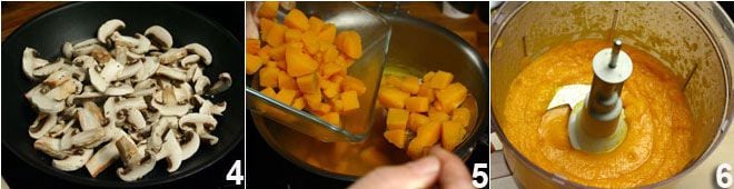 Al final de la cocción, añada un poco de sal a las setas. Cuando la calabaza esté cocida, escúrrala bien 5, conserve el agua de cocción que servirá para mojar el risotto y reduzca la calabaza a un puré con la batidora 6.