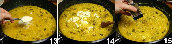 Continúe la cocción del arroz 10 y cinco minutos antes del final, añada las setas a la cacerola del arroz 11; deje que finalice la cocción, luego apague el fuego 12.