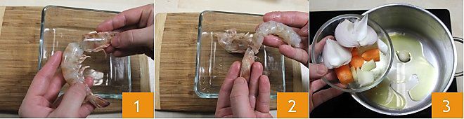 Para preparar el risotto con langostinos, primero limpiad los langostinos, quitándoles la cabeza 1 y la cáscara, pelándolos hasta la cola 2. Separad los langostinos de las cáscaras, que reservaréis para preparar el caldo. Laváis y limpiáis bien las verduras para el caldo, cortadlas en trozos y dejadlas dorarse, a fuego medio, en una cacerola grande, con un poco de aceite 3.