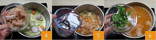Añadid las cáscaras y las cabezas de los langostinos 4, dejad cocinar durante un par de minutos, aplastando las cabezas con una cuchara de madera, para liberar todos los jugos. Agregad el agua 5 y las ramitas de perejil 6 luego dejad hervir a fuego moderado. Si es necesario, podéis ajustar la sal a vuestro gusto.