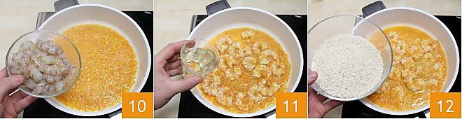 En cuanto el sofrito esté listo, añadid los langostinos pelados 10, dejadlos dorarse a fuego alto; cuando hayan liberado su líquido, rociad con vino blanco y dejad evaporar 11. Bajad el fuego y añadid el arroz, que tostaréis durante un par de minutos 12.