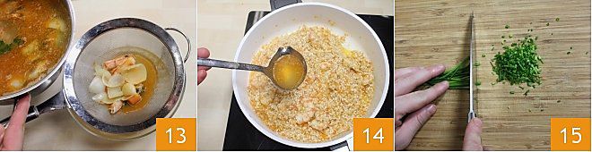 Mientras tanto, colad el caldo de pescado 13 y añadidlo, un cucharón a la vez, al risotto 14. Cocinad el arroz durante unos 18 minutos a fuego moderado, agregando más caldo solo cuando el arroz haya absorbido el líquido anterior. Durante este tiempo, picad finamente el cebollino 15.