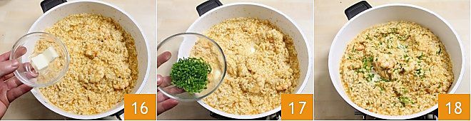 Cuando la cocción esté completa, retirad el risotto del fuego, añadid la mantequilla y el cebollino picado (16-17) y mantecad el risotto. Servid vuestro risotto con langostinos inmediatamente: ¡buen provecho!