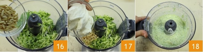 Luego, vierte los calabacines en una batidora, añade los piñones 16, el yogur griego 17 y acciona las cuchillas hasta obtener una mezcla homogénea 18. Si prefieres obtener un resultado aún más denso y cremoso, puedes mezclar el pesto de calabacín y el yogur en un recipiente ayudándote con una cuchara.