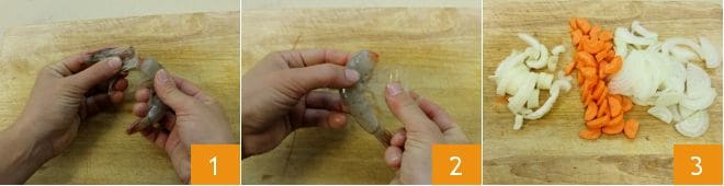 Para preparar el risotto al pesto de calabacín, yogur y gambones, comienza con la limpieza de los gambones que servirán para el risotto y para preparar el fumet de crustáceos, cuyo procedimiento también puedes encontrar Caldo de mariscos. Enjuaga los gambones bajo agua corriente, colócalos sobre una tabla de cortar y retira suavemente la cabeza y el caparazón (1-2) de cada uno. Reserva las cabezas y caparazones para preparar el fumet y en otro recipiente recoge las carnes. Si prefieres, puedes dejar algunos gambones pelados pero con la cola para saltear en una sartén con un poco de aceite para la decoración final del plato. Luego pasa a lavar, limpiar y cortar en trozos el tallo de apio y la zanahoria; corta en rodajas también la cebolla, previamente privada de las capas más externas 3.