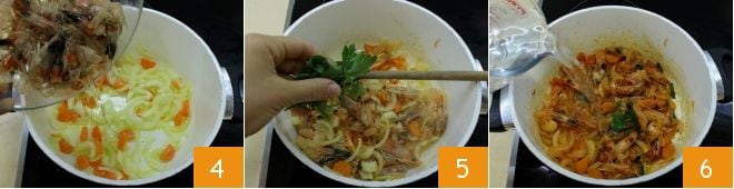 Coloca el sofrito en una cacerola grande con un poco de aceite. Sofríe ligeramente por unos instantes a fuego bajo, luego añade los caparazones y las cabezas de los gambones. Agrega también el perejil fresco desmenuzado directamente en la cacerola con las manos 5. Añade también 1,5 litros de agua 6.
