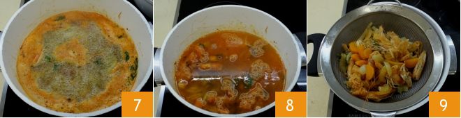 Ajusta de sal y pimienta y deja cocer durante al menos 30-40 minutos a fuego bajo 7; durante la cocción puedes espumar el fumet con una espumadera, asegurándote cada vez de enjuagarla para eliminar cualquier residuo. El fumet debería reducirse a más o menos la mitad del líquido inicial 8. Pasado este tiempo, filtra el fumet con un colador de malla fina 9 tratando de recoger la mayor cantidad de líquido posible. Descartar los caparazones,