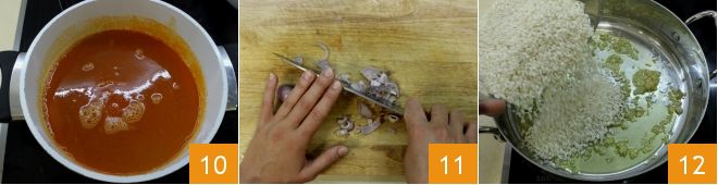 y reserva el fumet obtenido 10 para añadir al risotto y facilitar la cocción. Para preparar el risotto, comienza con el sofrito: en una tabla de cortar, limpia y pica finamente el chalote 11. Viértelo en una cacerola grande con 30 g de mantequilla y sofríe por unos instantes a fuego bajo, luego añade el arroz Carnaroli en lluvia 12.