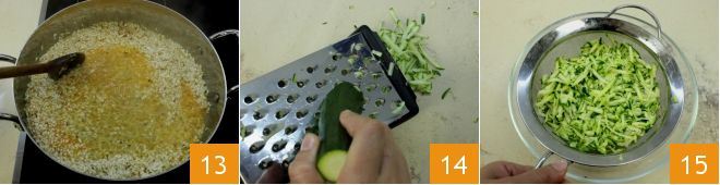 Tuesta el arroz por unos minutos, luego añade el vino blanco y deja que se evapore. En este punto, puedes añadir un cucharón de fumet de crustáceos filtrado, mezclando con una cuchara de madera y esperando a que se absorba bien antes de añadir otro. Mientras el risotto se cocina, puedes preparar el pesto de calabacín. Ralla los calabacines 14. Luego deja escurrir el agua de vegetación en un colador de malla fina (puedes acelerar la operación colocando un platillo y un peso sobre los calabacines para que pierdan más líquido con la presión).