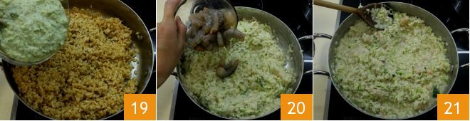 Vierte el pesto de calabacín y yogur en el risotto 19, deja que se mezcle por unos instantes y, si es necesario, añade un cucharón más de fumet. Cuando falten pocos minutos para la cocción del risotto, añade también los gambones crudos 20 que habías reservado anteriormente. Mezcla bien con una cuchara de madera para amalgamar los ingredientes 21.