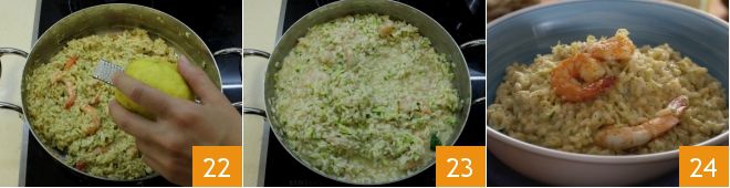 En este punto, ralla también la ralladura de 1 limón sin tratar directamente sobre el risotto 22. Ajusta de sal y pimienta al gusto, luego apaga el fuego y mezcla el risotto con la mantequilla restante. Apaga el fuego y tu risotto al pesto de calabacín, yogur y gambones está listo para ser disfrutado 23. Puedes emplatar, decorando si quieres con algunos gambones salteados en sartén 24.