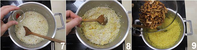 Después de 10 minutos añade el azafrán 7 y continúa la cocción añadiendo más caldo y mezclando 8. Cuando la cocción esté casi terminada, añade las setas cocidas 9 y ajusta de sal, si es necesario. Completa con una pizca de pimienta y con el fuego apagado, añade el parmesano y mezcla. Sirve el risotto amarillo con rebozuelos caliente.