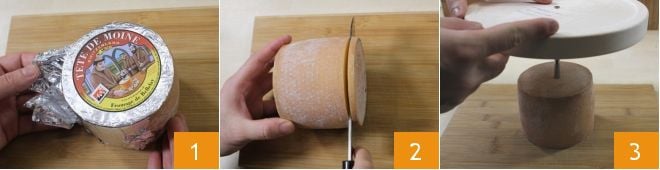 Para preparar el risotto peras y Tête de Moine, descartad el queso 1, cortad la cubierta 2 y colocad la forma, con la parte cortada hacia abajo, sobre una tabla de cortar. Insertad el eje de la girolle en el centro de la forma 3 y