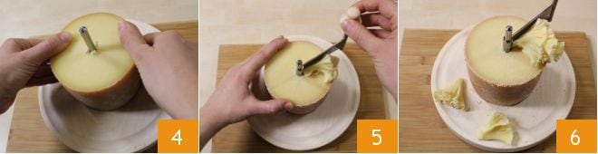 gira la forma, empujando el queso hacia abajo hasta el fondo 4. Insertad en el eje el cuchillo y girad suavemente sobre el queso para obtener finas láminas con forma de rosa (5-6).