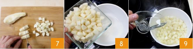 Pela y corta en cubos las peras 7 luego colócalas en un cazo 8 y rocíalas con 50 ml de vino blanco, tomado de la dosis total 9 y un cucharón de caldo y cuécelas por unos minutos.