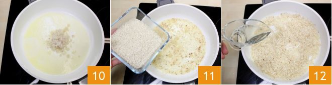 Pica finamente la chalota y sofríela a fuego lento en una cacerola grande con la mantequilla 10. Luego añade el arroz y tuéstalo 11. Cuando el arroz esté transparente, rocía con los 100 ml de vino blanco restantes 12.