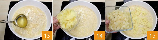 Moja con un par de cucharones de caldo 13, añadiéndolo cada vez que el arroz se haya secado. A mitad de cocción añade 100 gr de Tête de Moine 14 y las peras escaldadas con su líquido de cocción 15, ajusta de sal y mezcla bien.