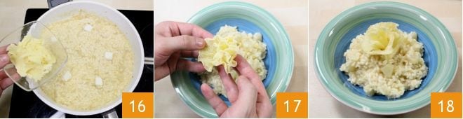 Continúa la cocción del risotto, añadiendo un cucharón de caldo cada vez que sea necesario y cuando el risotto esté cocido, apaga el fuego y manteca con la mantequilla y otros 35 gr de Tête de Moine 16. Sirve el risotto de peras y Tête de Moine bien caliente, adornándolo con una bonita rosa de queso en el centro del plato (17-18)!
