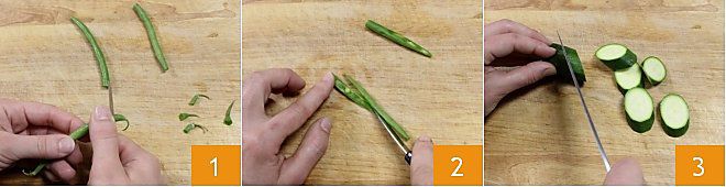 Para preparar el rodaballo gratinado con verduras, comienza preparando estas últimas. Lava todas las verduras bajo agua corriente fría. Luego, con las manos, corta las puntas de las judías verdes, retirando ambos extremos 1, luego con un cuchillo corta las judías verdes a la mitad o, para una estética más agradable, realiza una incisión oblicua a lo largo 2. Luego pasa a los calabacines: quítales los extremos y córtalos en rodajas oblicuas de unos 2 cm 3.