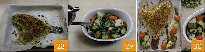 Cuando el rodaballo esté cocido y la cobertura dorada, sácalo del horno 28, recupera las verduras que habías reservado y añade a estas últimas el perejil roto con las manos, sal al gusto y un chorrito de aceite 29. Luego sirve tu rodaballo gratinado con verduras bien caliente. Puedes servir el rodaballo en un plato de servir acompañado de las verduras o, para una presentación más "rústica", dejarlo en la bandeja y colocar un poco de verduras alrededor del pescado, mientras que las otras sirven de guarnición en el bol 30!