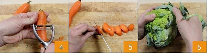 Ahora pela las zanahorias con un pelador de verduras 4 o un cuchillo afilado; luego corta los extremos y reduce las zanahorias a rodajas oblicuas de unos 2 cm 5. Finalmente, pasa a limpiar la coliflor verde: deshoja con las manos 6.