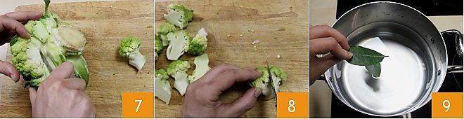 Con un cuchillo pequeño, separa las flores de la coliflor, cortando donde las flores se encuentran con el tronco central 7 y luego divídelas a la mitad 8. Ahora que las verduras están listas, puedes tomar una vaporera y llenarla hasta la mitad con agua. Añade las hojas de laurel 9 y calienta el agua.
