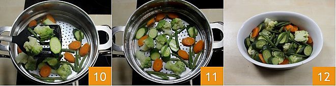 Cuando el agua esté caliente, coloca la rejilla de la vaporera y vierte las verduras en trozos (10-11); cocina las verduras durante 15 minutos. Si no tienes una vaporera, puedes hervir las verduras durante 8-10 minutos en una olla grande. Cuando estén listas, transfiérelas a un bol y resérvalas 12.
