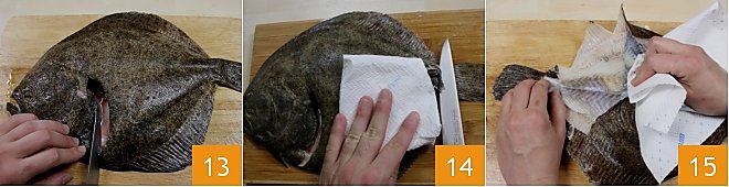 Ahora pasa a limpiar el rodaballo. Enjuaga el pescado bajo agua corriente fría. Transfiérelo a una tabla de cortar y haz una incisión en arco detrás de la agalla (en el lado cubierto de piel oscura) para eliminar las vísceras 13. Luego enjuágalo nuevamente bajo agua corriente. Luego haz un corte al inicio de la cola para quitar la piel 14. Para esta operación, ayúdate con un cuchillo y un paño de cocina (o papel de cocina) porque la piel del rodaballo es muy resbaladiza y dura. Luego levanta el borde y retira la piel suavemente 15.