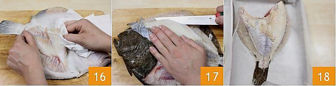En este punto, puedes elegir si cocinar el rodaballo en filetes o entero. En el primer caso, elimina también la piel del otro lado como se indicó en los pasos anteriores 16 y con la punta afilada de un cuchillo corta la carne obteniendo 4 filetes de un lado y del otro del pescado, dejando intacta la columna central. Si eliges cocinar el pescado entero, deja la piel blanca pero corta las aletas 17 y la cabeza haciendo un corte en arco desde donde quitaste las vísceras. Luego forra una bandeja con papel de horno y coloca el rodaballo en ella 18.