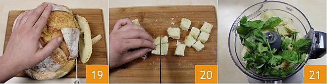 Pasa entonces a preparar los ingredientes para la cobertura: de la hogaza de pan 19 saca la miga que dividirás en cubos 20 (puedes usar también pan duro). Luego pon la miga en la batidora junto con la mezcla de hierbas aromáticas: perejil, albahaca, tomillo, romero y menta 21.