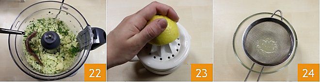 Pica todos los ingredientes. Luego añade los filetes de anchoa, sal y pimienta al gusto y un chorrito de aceite de oliva virgen extra 22; vuelve a encender la batidora. Finalmente, exprime el jugo de medio limón 23 y cuélalo con un colador de malla fina 24.