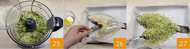 Añade el jugo de limón directamente en la batidora 25 y enciéndela por última vez, hasta obtener una mezcla homogénea. Ahora unta la superficie del rodaballo con aceite ayudándote con un pincel 26 y puedes espolvorearlo con la mezcla para la cobertura, vertiéndola sobre todo el rodaballo con una cuchara 27. Termina con un chorrito de aceite. Ahora que el rodaballo está condimentado, cocínalo en horno estático durante 10 minutos a 200° y luego 5 minutos en función grill a 230°. Si usas el horno ventilado, cocina durante 10 minutos a 190°.