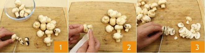 Para realizar los rollitos de pollo con champiñones y salsa de mostaza, empezad limpiando los champiñones: con un cuchillo pequeño eliminad la parte terrosa del tallo 1, raspándola con delicadeza hasta eliminar cualquier rastro de tierra, luego frotad suavemente la superficie con un paño de algodón humedecido 2 teniendo cuidado de no estropear los champiñones. Cortad los champiñones en láminas 3 y reservadlos.