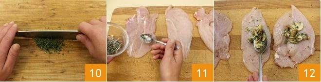 Picad el tomillo 10 y ponedlo en un bol pequeño, añadid también la sal y mezclad para amalgamar, distribuid el picadillo de aromas sobre las lonchas de pollo 11, luego rellenad con una cucharada de champiñones la parte central de las lonchas, dejando el borde libre 12 (reservad los champiñones sobrantes).