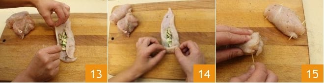 doblad hacia dentro los lados largos de las lonchas para evitar que se salga el relleno 13 y luego enrolladlas 14, fijad los rollitos con unos palillos 15 para que no se abran durante la cocción.