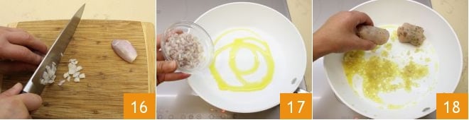 Reservad los rollitos, pelad y picad la chalota 16, calentad un hilo de aceite de oliva en sartén y pochad la chalota 17 durante al menos 5 minutos a fuego bajo, colocad en la sartén los rollitos de pollo y champiñones con salsa de mostaza 18