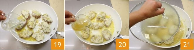 y doradlos por ambos lados durante un par de minutos, luego rociad con el vino blanco 19 y añadid el caldo de pollo 20 y coced durante 10 minutos con la tapa puesta y otros 10 minutos más 21,