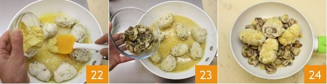 luego incorporad la mostaza 22 y coced durante 3-4 minutos más, al final de la cocción añadid los champiñones sobrantes 23 y saltead todo junto durante unos instantes y servid los rollitos de pollo con champiñones y salsa de mostaza bien calientes 24.