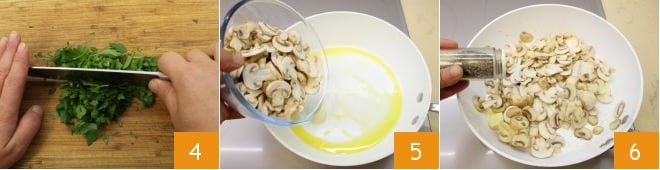 Lavad y picad el perejil fresco 4, en una sartén calentad un hilo de aceite y sazonadlo con un diente de ajo, añadid los champiñones en láminas 5 y saltead los champiñones durante 4-5 minutos, salpimentad 6