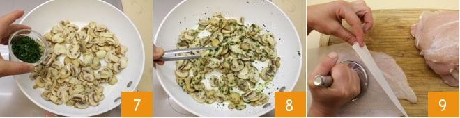 luego aromatizad con el perejil picado 7, mezclad y eliminad el diente de ajo con unas pinzas de cocina 8, dejad enfriar los champiñones. Encargaos de la carne, colocad las lonchas de pollo entre dos hojas de papel de horno (para no deshilachar la carne) y golpeadlas con el mazo de cocina 9.