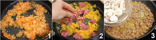 Para preparar el rollo de polenta con salchicha y champiñones, empieza pelando la zanahoria, el ajo y la cebolla, luego pícalos junto con el tallo de apio: coloca el picadillo dentro de una cacerola grande en la que habrás calentado 4-5 cucharadas de aceite de oliva virgen extra 1. Deja que se sofría a fuego lento durante unos 15 minutos sin que coja color, luego añade la salchicha desmenuzada 2 y sube un poco el fuego para que la carne se dore. Desglasa con un vaso de vino blanco (a temperatura ambiente) y luego añade la pimienta molida, los champiñones 3 bien limpios y cortados en rodajas no muy finas y deja cocinar durante unos 10-15 minutos, a fuego lento ajustando de sal. Cuando los champiñones estén tiernos, añade el tomate, deja cocinar durante unos minutos hasta que la salsa se seque, luego ajusta nuevamente de sal si es necesario,