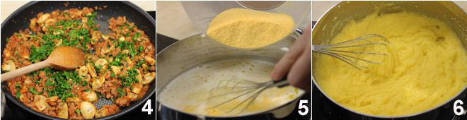añade el perejil picado 4, mezcla y apaga el fuego. Prepara la polenta vertiendo en una cacerola (mejor si es antiadherente) el agua y llévala a ebullición: añade la sal y luego el aceite de oliva virgen extra, luego vierte la harina en forma de lluvia dentro del agua en ebullición mezclando con vigor con una varilla 5, para evitar la formación de grumos. Deja cocinar a fuego lento durante al menos 5 minutos mezclando continuamente 6, luego apaga el fuego y