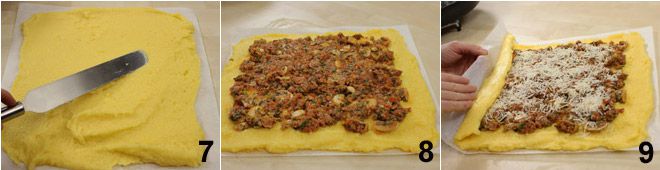 vierte la polenta sobre un rectángulo de papel de horno de dimensiones de 30 cm x 35 cm, extendiéndola y nivelándola bien 7. Vierte sobre el rectángulo de polenta el compuesto de salchicha y champiñones 8 dejando aparte dos cucharadas para la decoración final; distribuye el compuesto sobre toda la superficie dejando todo alrededor un borde libre de 3-4 cm, luego espolvorea con 4 cucharadas de queso rallado 9.