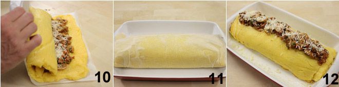 Ayudándote con el papel de horno, comienza inmediatamente a enrollar la polenta aún caliente 10, hasta formar un cilindro que cerrarás con el papel de horno 11 y dejarás reposar durante unos minutos con el extremo hacia abajo, antes de colocarlo en una fuente engrasada con una cucharada de aceite de oliva virgen extra. Antes de hornearlo, espolvorea la parte superior del rollo con el compuesto de salchicha, espolvoréalo con una cucharada de queso rallado 12 y hornea el rollo de polenta en horno precalentado a 200° durante unos 20-25 minutos. Pasado el tiempo necesario, saca del horno el rollo de polenta con salchicha y champiñones, déjalo reposar 10 minutos y luego sírvelo cortándolo en rodajas.